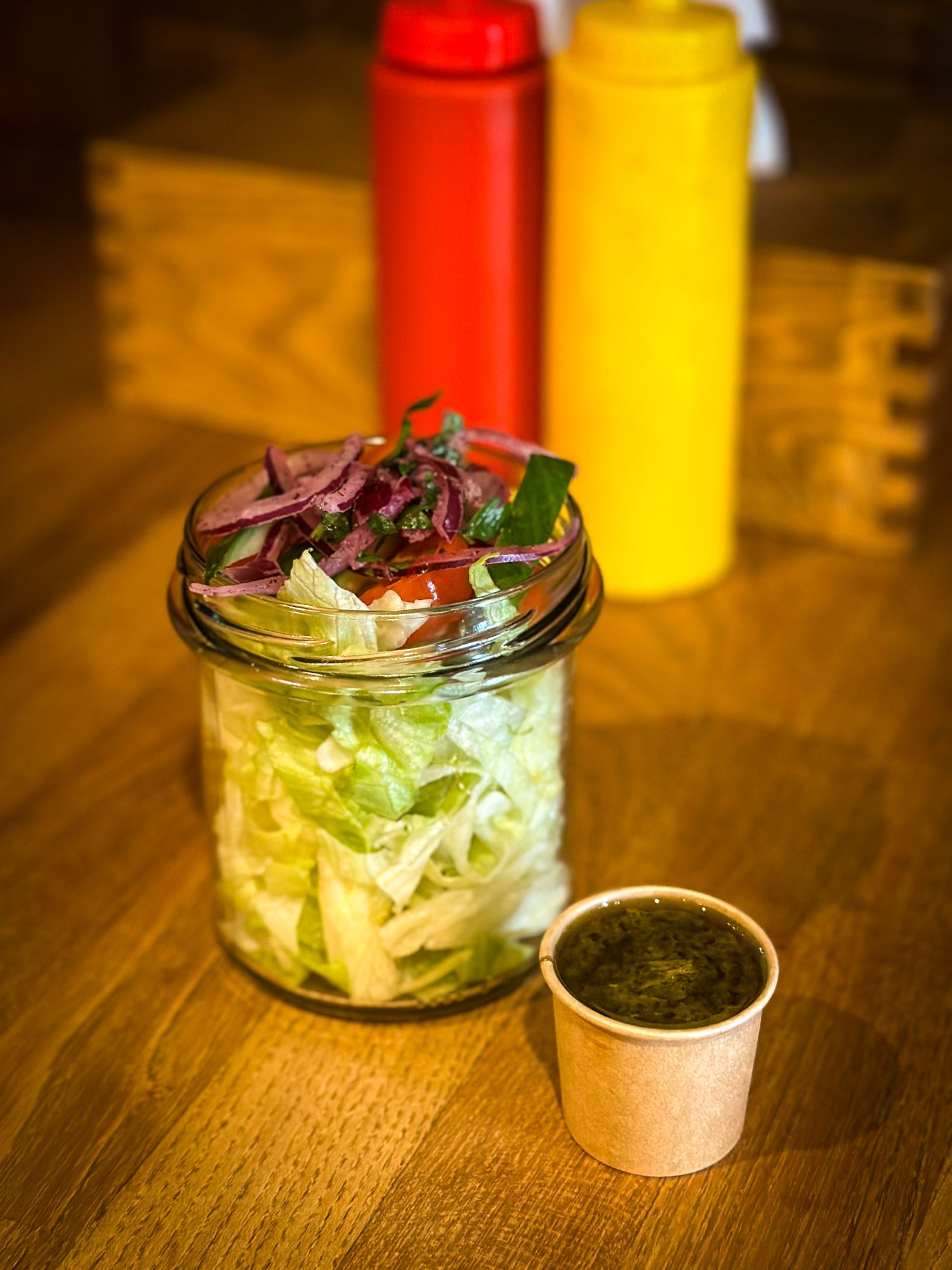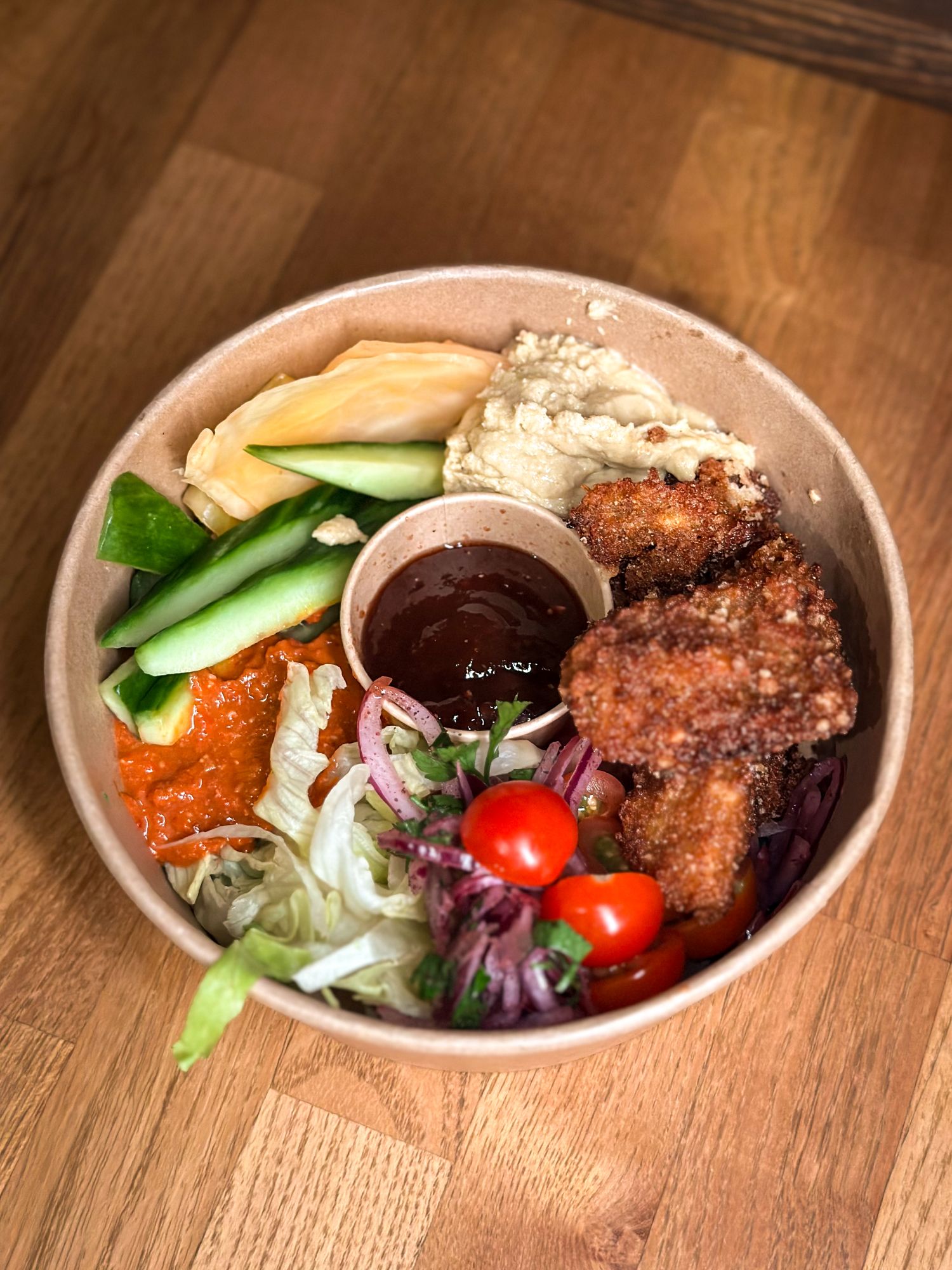 BOCZNIAKI W PANKO 140G, HUMMUS, MUHAMARA, SAŁATA LODOWA, OGÓREK ZIELONY, CEBULA Z SUMAKIEM POMIDORKI CHERRY, KISZONA KAPUSTA W CURRY SOS DO WYBORU - POLECAMY BBQ