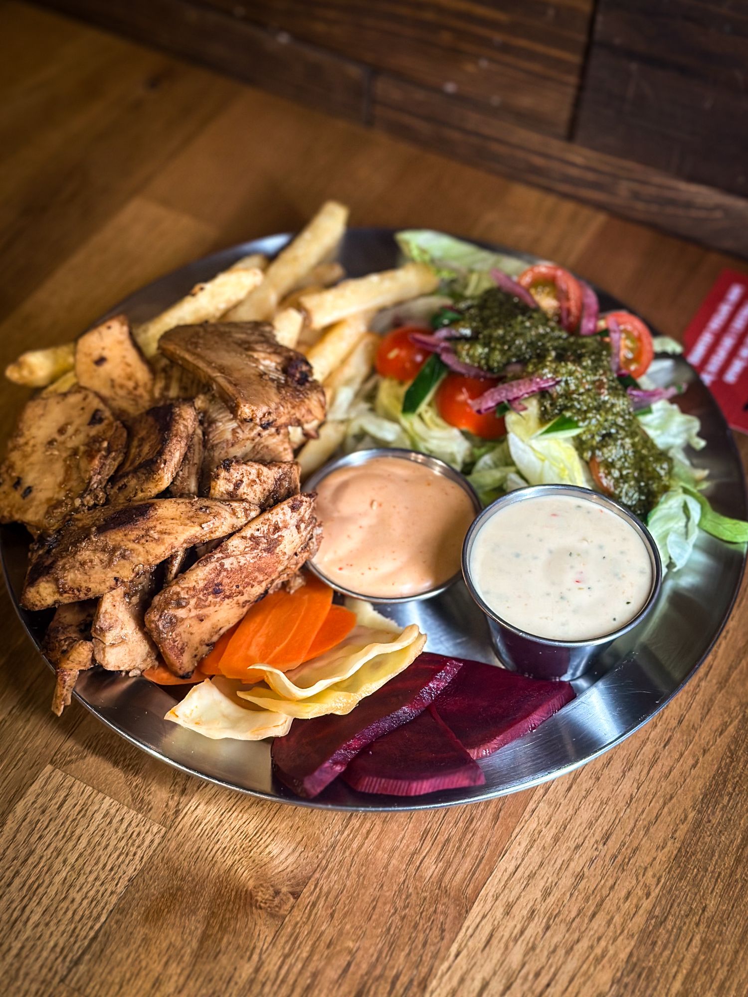 140 g mięsa wołowo-baraniego 70%baraniny-30% wołowiny, chrupiące frytk/ryż z kurkumą i ziołami/hummus, mix świeżych warzyw, sos