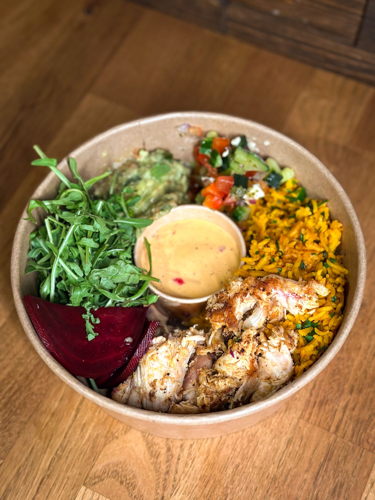 SZARPANY KURCZAK Z ROŻNA 130G, RYŻ Z KURKUMĄ I ZIOŁAMI, GUACAMOLE, RUKOLA, SAŁATKA SZOPSKA, KISZONY BURAK SOS DO WYBORU - POLECAMY MIESZANY