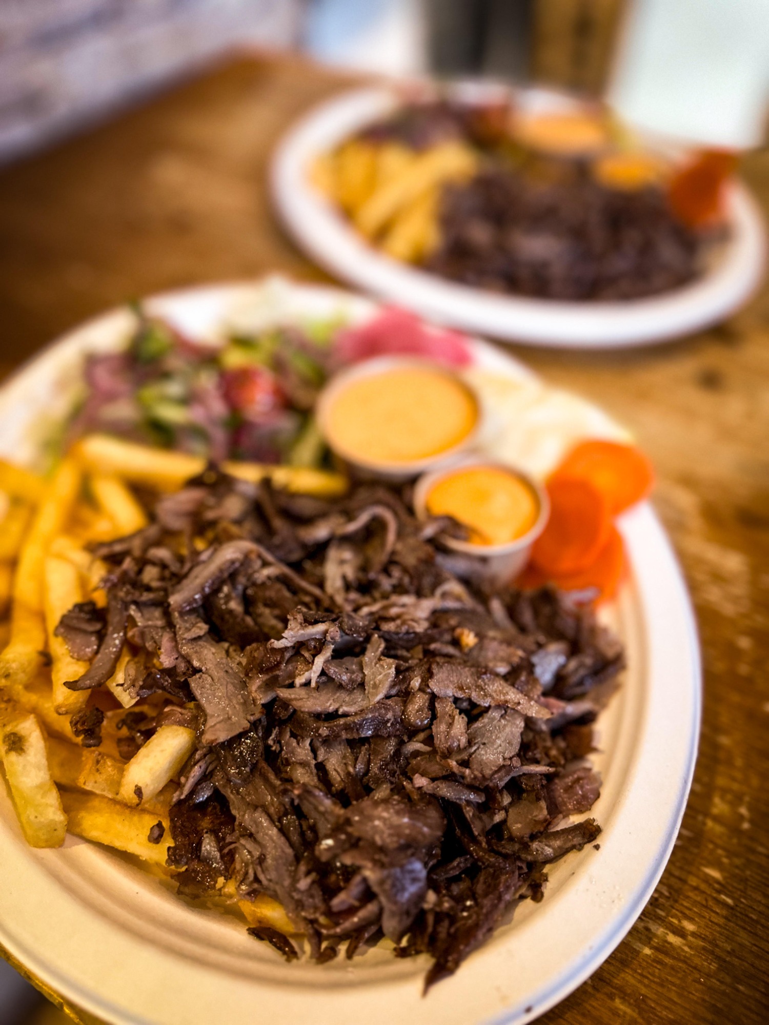 MIĘSO WOŁOWO-BARANIE 140G, BUŁKA Z LOKALNEJ PIEKARNI, PIECZONE NA ROŻNIE WARZYWA: CUKINIA, PAPRYKA, BAKŁAŻAN, ZIEMNIAKI, CEBULA, ŚWIEŻE WARZYWA: PAPRYKA, POMIDOR, OGÓREK, CEBULA, SAŁATA LODOWA, MACEROWANA CZERWONA KAPUSTA, OWCZY SER BAŁKAŃSKI, ŚWIEŻA MIĘTA, KILKA KROPEL CYTRYNY