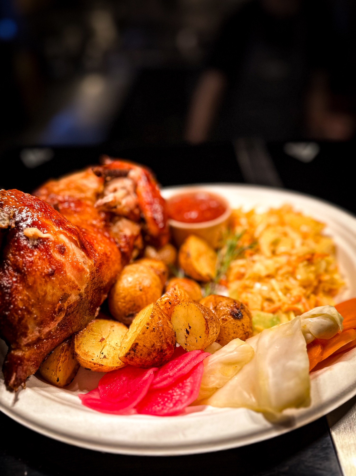 SZARPANY KURCZAK Z ROŻNA 150G, BUŁKA Z LOKALNEJ PIEKARNI, PIECZONE NA ROŻNIE WARZYWA: CUKINIA, PAPRYKA, BAKŁAŻAN, ZIEMNIAKI, CEBULA, ŚWIEŻE WARZYWA: PAPRYKA, POMIDOR, OGÓREK, CEBULA, SAŁATA LODOWA, MACEROWANA CZERWONA KAPUSTA, OWCZY SER BAŁKAŃSKI, ŚWIEŻY KOPEREK, KILKA KROPEL CYTRYNY -